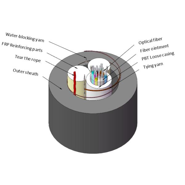 Product Description The structure of the optical cable is to insert single-mode or multi-mode optical fibers into a loose tube made of high modulus plastic and filled with waterproof compound. Two non-metallic reinforcing parts serve as reinforcement and self-supporting support. Water-blocking yarn is placed in the gap of the cable core, and tear ropes are pre-embedded. A layer of polyethylene outer sheath is extruded on the surface to form a cable.
